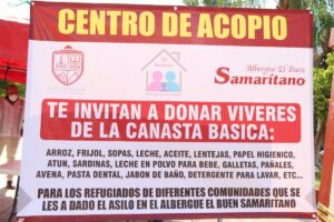 Frente al palacio municipal, la primera dama del municipio, pidió el apoyo de la ciudadanía, para que acerquen alimentos no perecederos, agua embotellada, pañales, toallas sanitarias, artículos de aseo personal y productos de limpieza, mismos que serán donados a las personas refugiadas en el albergue que dirige el padre Gregorio López.