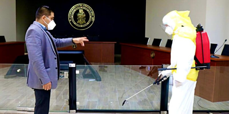 Uruapan, Mich; Jueves 21 de Enero de 2021.- Como parte de las acciones preventivas en favor tanto de trabajadores como de uruapenses que acuden a realizar trámites, se realizan constantes trabajos de limpieza y desinfección en las distintas áreas de la Administración Municipal, comunicó el secretario de Administración, Zaín Herrera Villagómez.