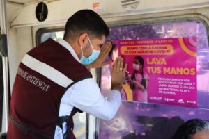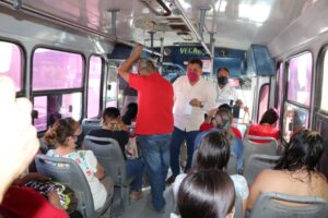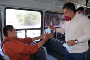 El alcalde verificó que tanto los choferes de combis y microbuses como los usuarios del transporte usen correctamente el cubrebocas y que se respete la sana distancia, “vemos que la población ha comenzado a crear conciencia sobre ello y eso nos alienta a no bajar la guardia contra el Covid-19”.