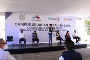 En el Campus Uruapan de la UMSNH, Silvano Aureoles y Miguel Paredes entregaron la 1ª etapa de construcción que incluye la terminación de los edificios 1 y 2 de aulas y del inmueble de administración académica por 8 millones 291 mil pesos. Además, marcaron el arranque de la última fase del edificio de aulas, construcción del laboratorio, auditorio, barda perimetral, andadores y red eléctrica. En estas acciones se destinarán 19 millones de pesos.