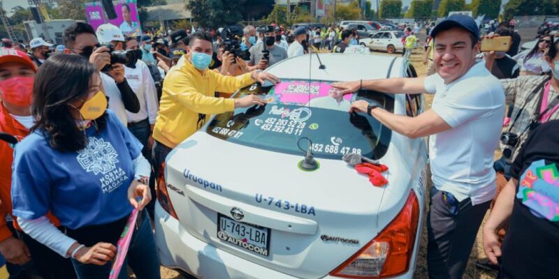 Uruapan, Mich; Domingo 25 de Abril del 2021.- Trabajadores del volante, en su modalidad de taxi, acompañaron al Candidato del Equipo por Uruapan a la alcaldía, Miguel Ángel Paredes Melgoza, esta mañana en evento encabezado por Carlos Herrera Tello, abanderado de la alianza Va x México a la Gubernatura.
