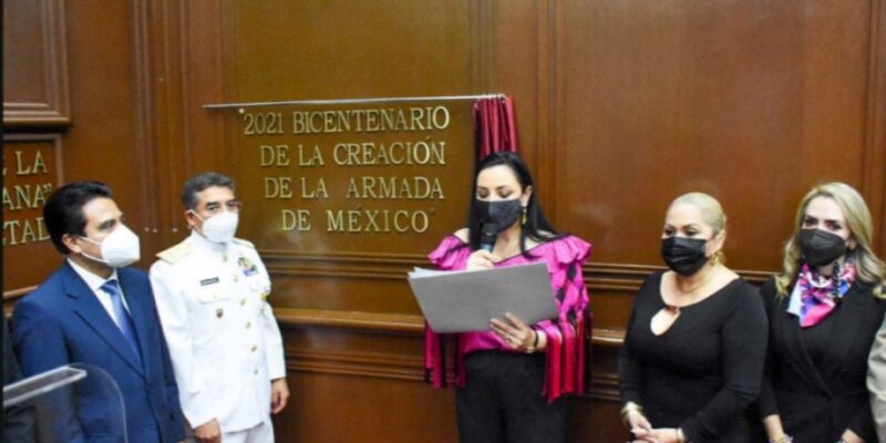 Morelia, Michoacán, 28 de septiembre de 2021. Con el propósito de reconocer la labor en pro de la paz, la seguridad y el bienestar de los mexicanos, el Congreso de Michoacán develó la Leyenda Conmemorativa “2021 Bicentenario de la Creación de la Armada de México”.