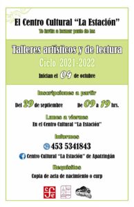 Apatzingán, Mich., a 29 de septiembre de 2021.- El Centro Cultural La Estación, iniciará los talleres artísticos y de lectura 2021-2022, para los que ya se abrieron inscripciones, informó la directora de la institución, Dilea Zacil Torres Flores.