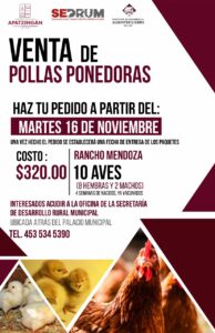 En atención a la instrucción del presidente municipal, José Luis Cruz Lucatero, detalló que el costo del paquete de pollas de postura con 10 piezas (8 hembras y 2 machos), es de 320 pesos, costo que está por debajo del precio en los establecimientos con venta de aves.