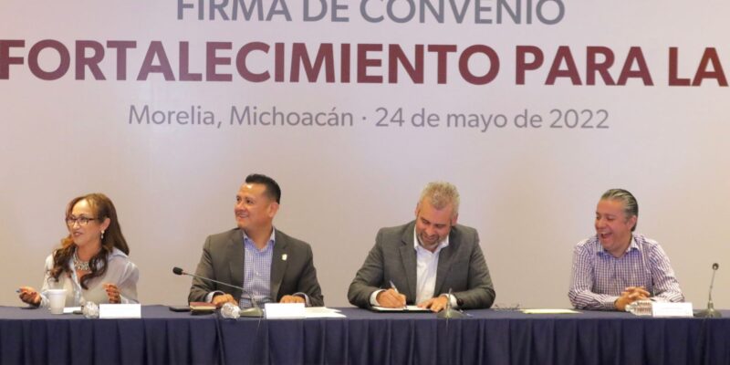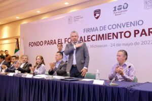 *Morelia, Michoacán, 24 de mayo del 2022.-* Un total de 64 municipios se han sumado al convenio de coordinación del Fondo de Fortalecimiento para la Paz (Fortapaz), confirmó el gobernador Alfredo Ramírez Bedolla, al ratificar la confianza en las demarcaciones para ejercer con responsabilidad los recursos destinados para seguridad.