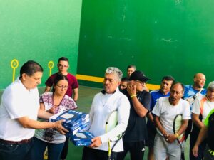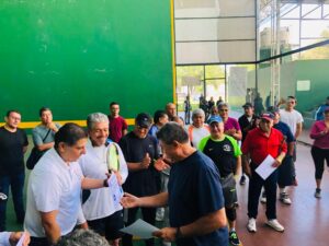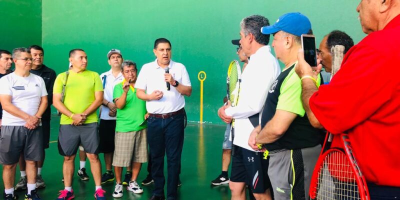 Nacho Campos dio el saque inicial y la declaratoria inaugural del evento y además entregó reflectores y lámparas para la iluminación de la cancha 2 en el complejo de frontón de la unidad deportiva “Hermanos López Rayón”.