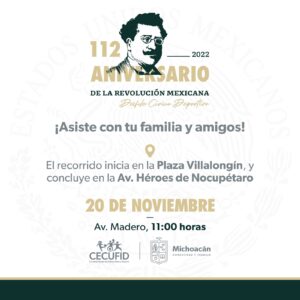 *Morelia, Michoacán, 16 de noviembre del 2022.-* El Gobierno de Michoacán, a través de la Comisión Estatal de Cultura Física y Deporte (Cecufid), informa que un total de 3 mil 500 personas participarán en el regreso del Desfile Cívico Deportivo del 20 de noviembre en la capital michoacana, con motivo del 112 Aniversario del inicio de la Revolución Mexicana.