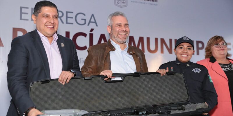 *Uruapan, Michoacán, 16 de diciembre del 2022.-* El gobernador Alfredo Ramírez Bedolla entregó 30 equipos de armas largas a policías municipales de Uruapan, con lo que se fortalece a la corporación como parte de la estrategia de pacificación.