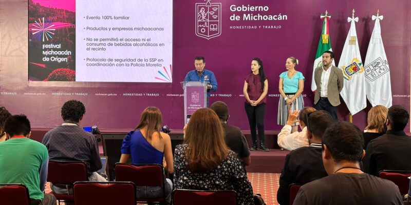 *Morelia, Michoacán, 18 de abril de 2023.-* El Gobierno del Estado presentó la segunda edición del Festival Michoacán de Origen, a realizarse del 28 de abril al 18 de mayo en las instalaciones del Centro de Convenciones y Exposiciones de Morelia (Ceconexpo).