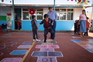 Nacho Campos indicó que la meta de la administración municipal es establecer 156 patios pedagógicos; son espacios que están enfocados a la estimulación cognitiva y motriz de los menores de edad, lo cual propicia un mejor desarrollo mental y físico, en beneficio de su formación integral. El presidente municipal recalcó la importancia de que padres de familia y profesores acompañen a la niñez en su etapa de aprendizaje, a fin de lograr mejores resultados.