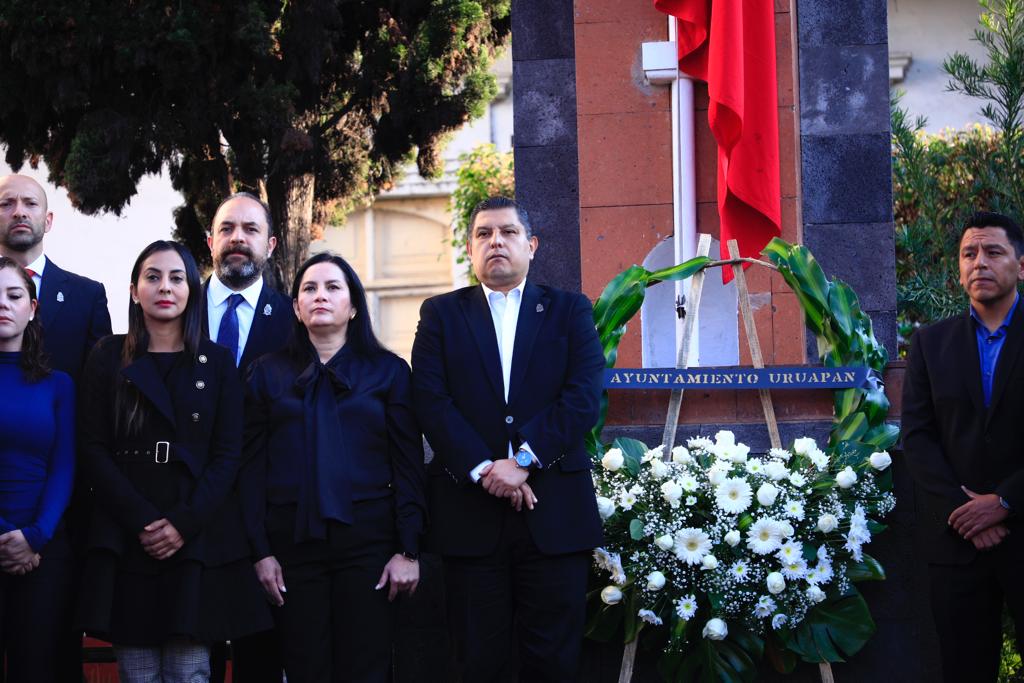 Uruapan, Mich., a 19 de septiembre de 2023 – El presidente municipal de Uruapan encabezó el acto en memoria de las víctimas del sismo de 1985 En punto de las 7 horas con 19 minutos, el Ayuntamiento, encabezado por Nacho Campos; la Junta Cívica, Patriótica y Conmemorativa; corporaciones de auxilio; y Luis Enrique Vega Sandoval, director de Protección Civil, participaron en el izamiento de la Bandera Nacional a media asta, guardaron un minuto de silencio y depositaron una ofrenda floral, en memoria de quienes perdieron la vida a causa del movimiento telúrico de 1985.