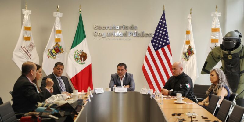 *Morelia, Michoacán, 24 de septiembre de 2025.-* El secretario de Seguridad Pública (SSP), Juan Carlos Oseguera Cortés, recibió a representantes de la Embajada de los Estados Unidos de América (EUA), con la finalidad de fortalecer los lazos de cooperación en materia de capacitaciones y coordinación a favor de la estrategia operativa en Michoacán.