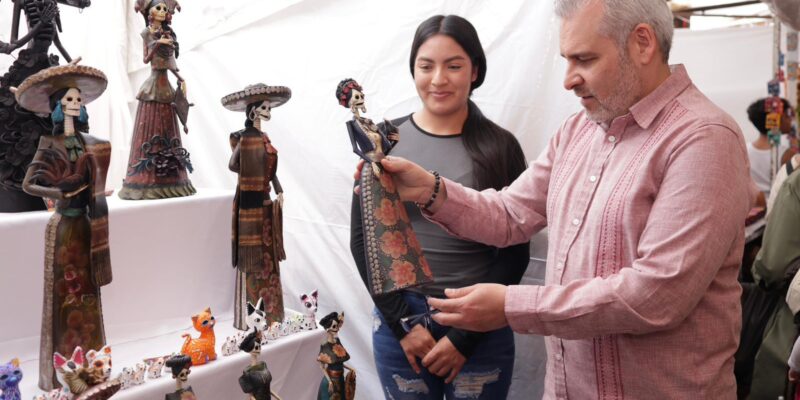 El gobernador explicó que las catrinas son elaboradas por manos de personas artesanas originarias de Capula, una tenencia de Morelia donde existen talleres tradicionales que preservan las técnicas y conocimientos, los cuales pasan de generación en generación.