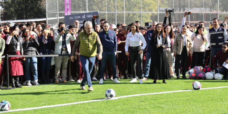 *Morelia, Michoacán, 10 de diciembre de 2025.-* Para impactar de manera positiva en el desarrollo físico, social, emocional y académico de las y los estudiantes, el gobernador Alfredo Ramírez Bedolla dio la patada inaugural de dos canchas de fútbol 7 en la Escuela Secundaria Federal No. 2 “Hermanos Flores Magón”.