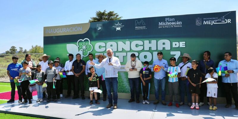 *Charapan, Michoacán, 8 de marzo de 2026.-* El gobernador Alfredo Ramírez Bedolla inauguró en la comunidad indígena con autogobierno de San Felipe de los Herreros, una cancha de futbol 7, para beneficio de más de 13 mil 500 habitantes, como parte de la estrategia estatal de recuperación de espacios públicos para la prevención del delito.